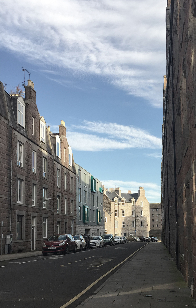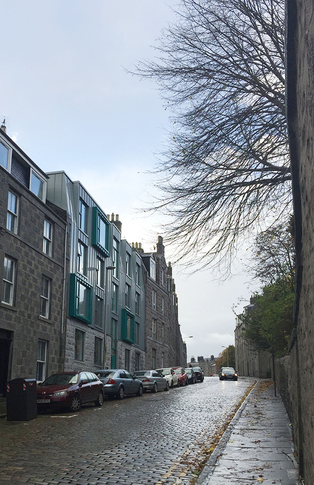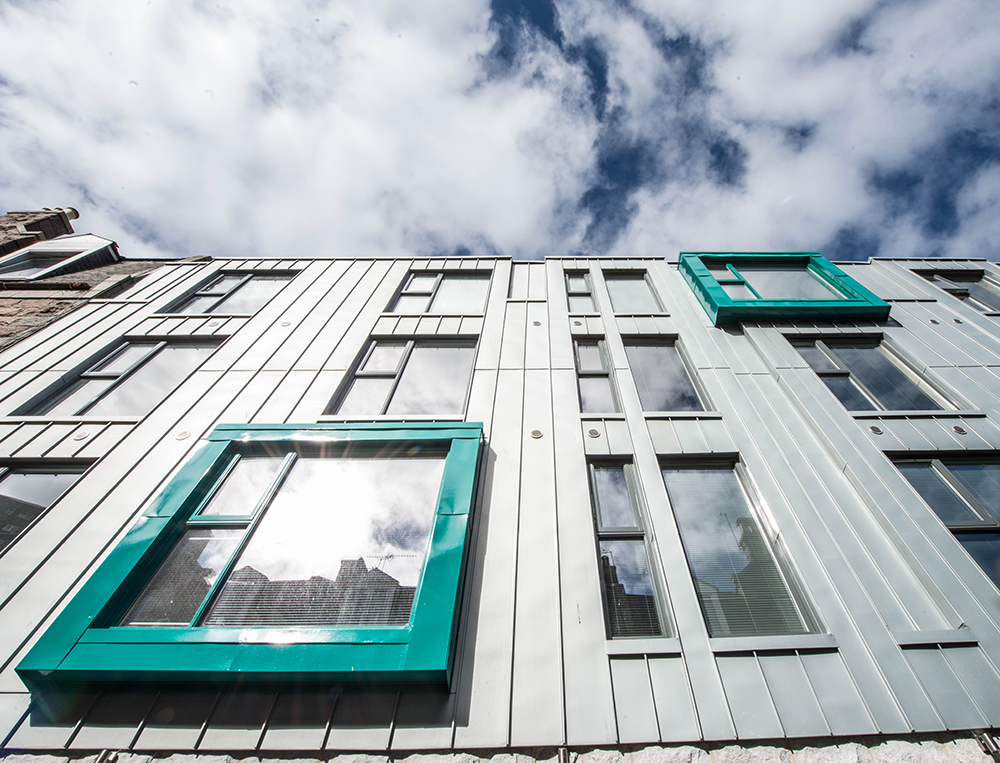 The contemporary aesthetic emerges from a carefully curated material palette that balances modernity with contextual sensitivity. The primary street-facing elevations are elegantly wrapped in zinc cladding, while the internal courtyard surfaces feature crisp off-white smooth render. To establish a meaningful dialogue with the surrounding built environment, we specified granite cladding for the building’s base and the distinctive two-storey element fronting Raeburn Place, creating visual continuity with Aberdeen’s rich architectural heritage.